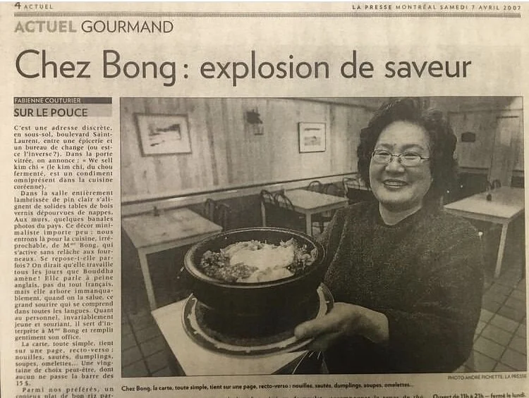 Après 15 ans en affaires, ils ont vendu le restaurant pour la retraite, mais (mal)heureusement Madame Bong ne pouvait pas être loin de la cuisine pour trop longtemps. Elle a donc ouvert Chez Bong sur St-Laurent en 2003 et bientôt les résidents ont découvert cet ‘hole in the wall.’ Le commerce a prospéré durant les trois premières années et c’est pas longtemps après que Madame Bong embauche ses enfants pour venir l’aider.